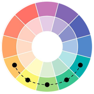 An analogous color combination is a combination of 2 to 5 colors that sit adjacent to each other on the color circle. It creates a smooth and pacifying feeling for the viewer and designers often opt to choose muted hues within these combinations.
